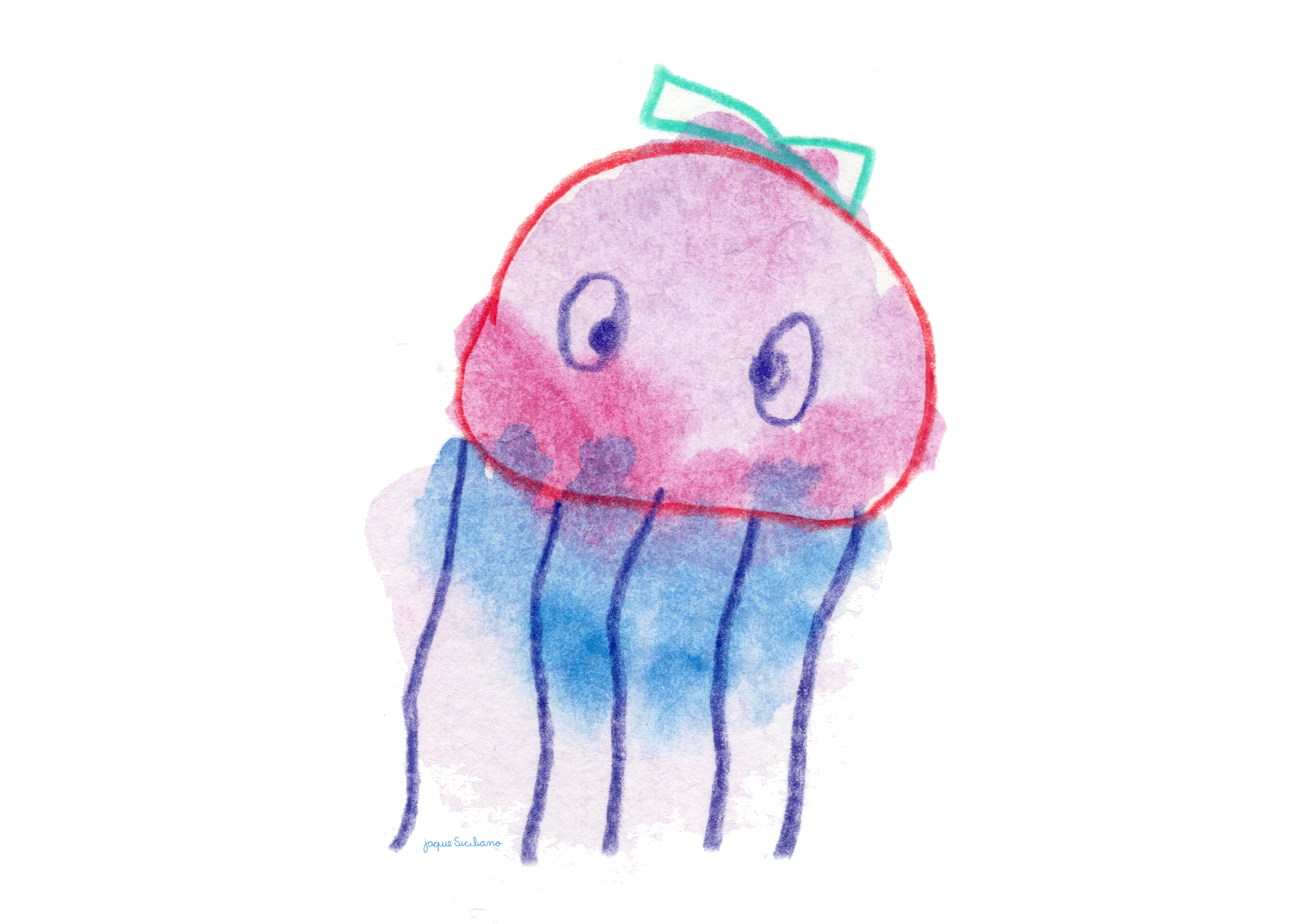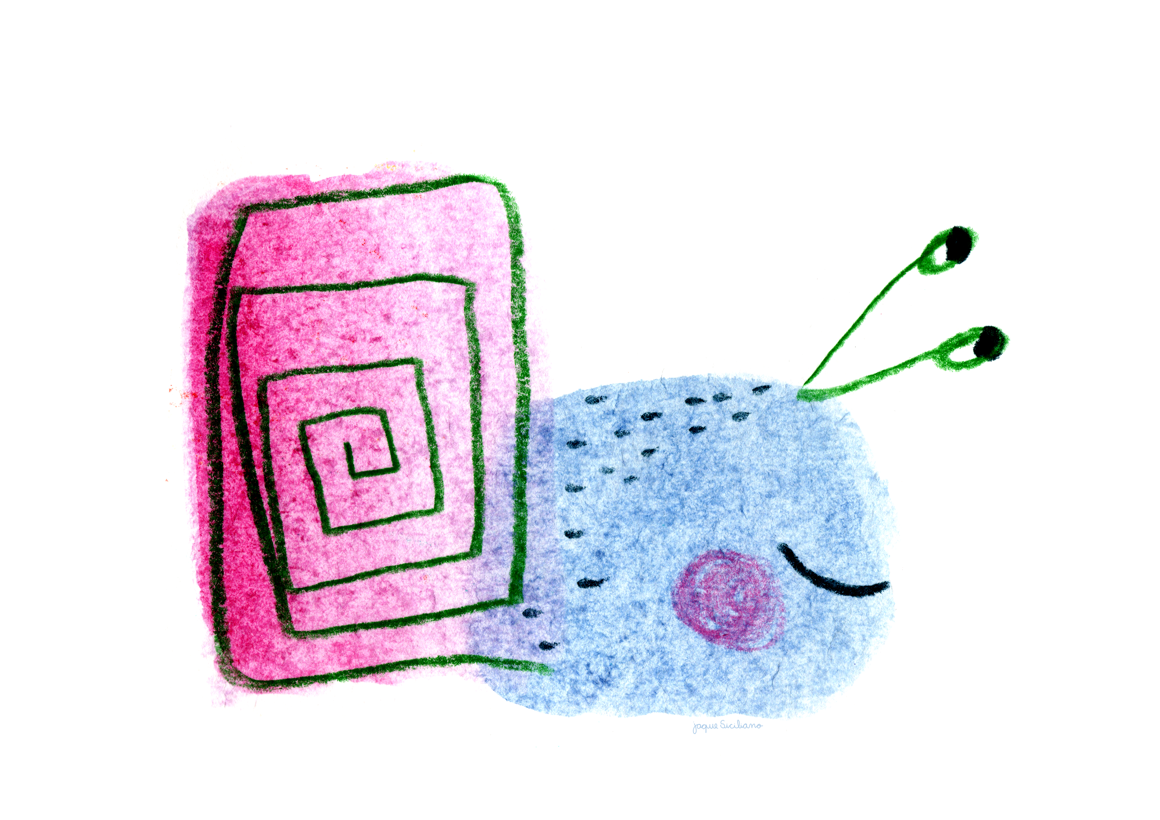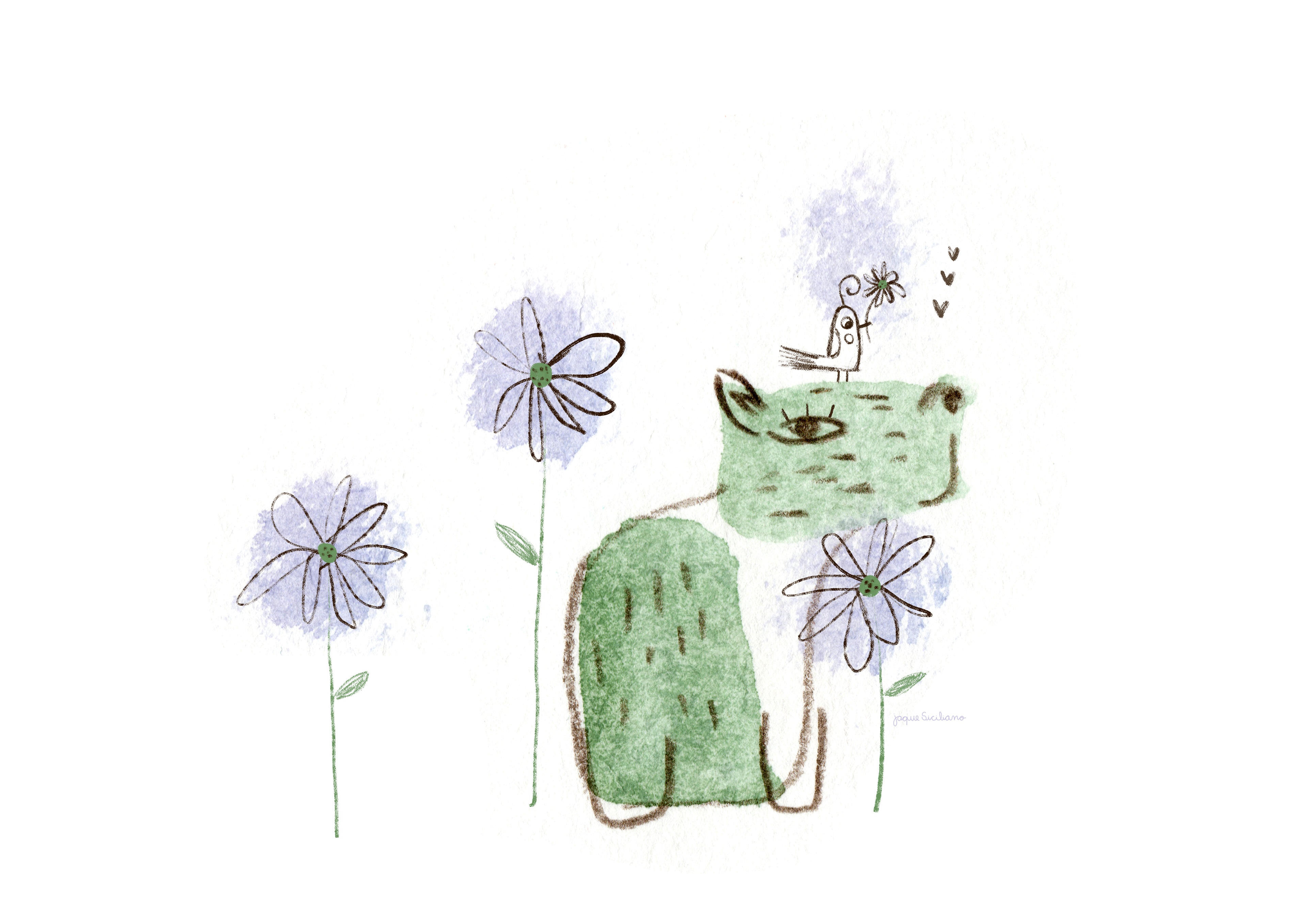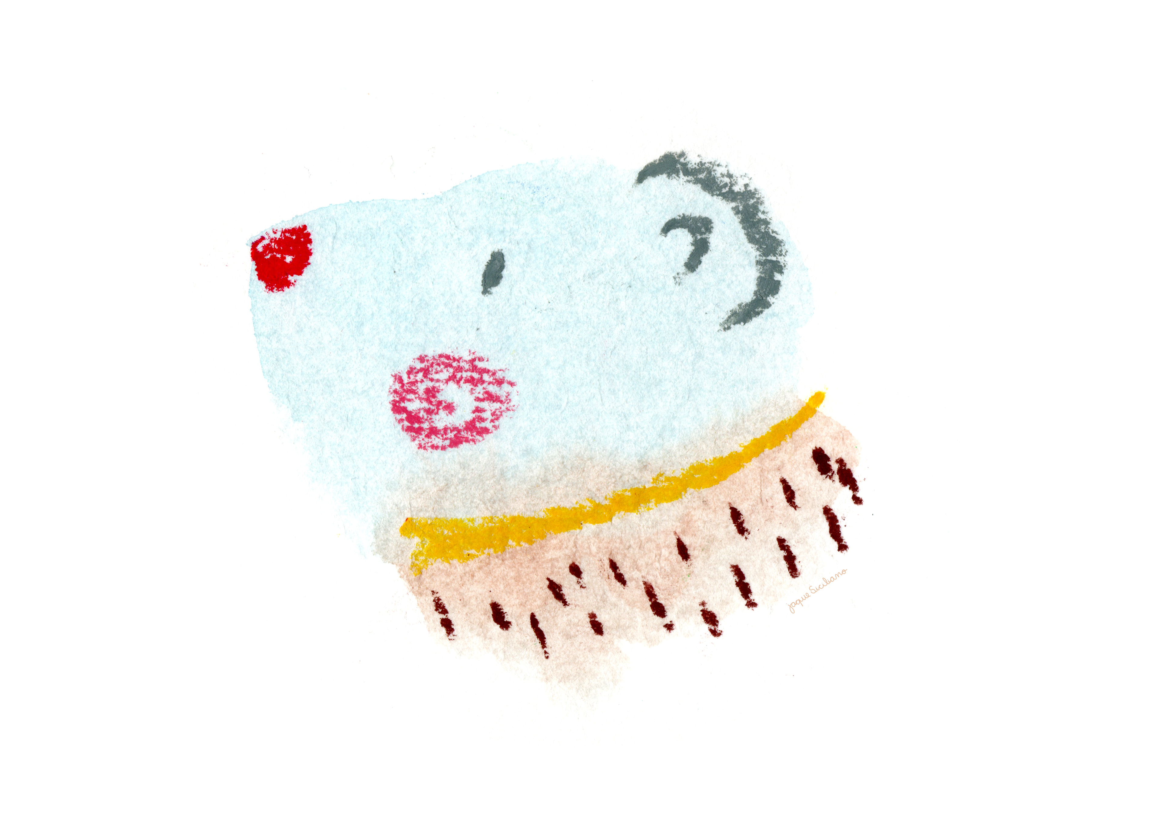 First I create watercolor stains, then I try to see images within those stains. With crayon I make the drawing over the watercolor, scan and finish in Photoshop. I try to mix colors in both watercolor and crayon, it's even more fun and cheerful!