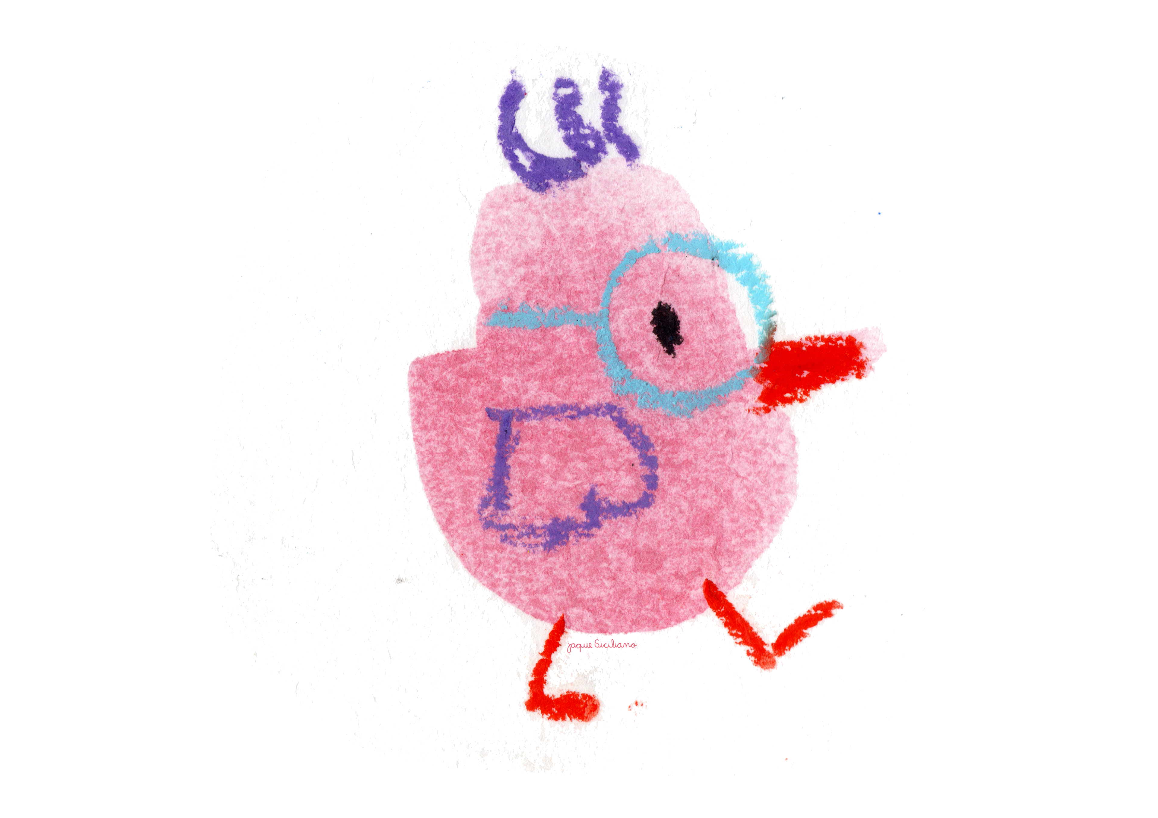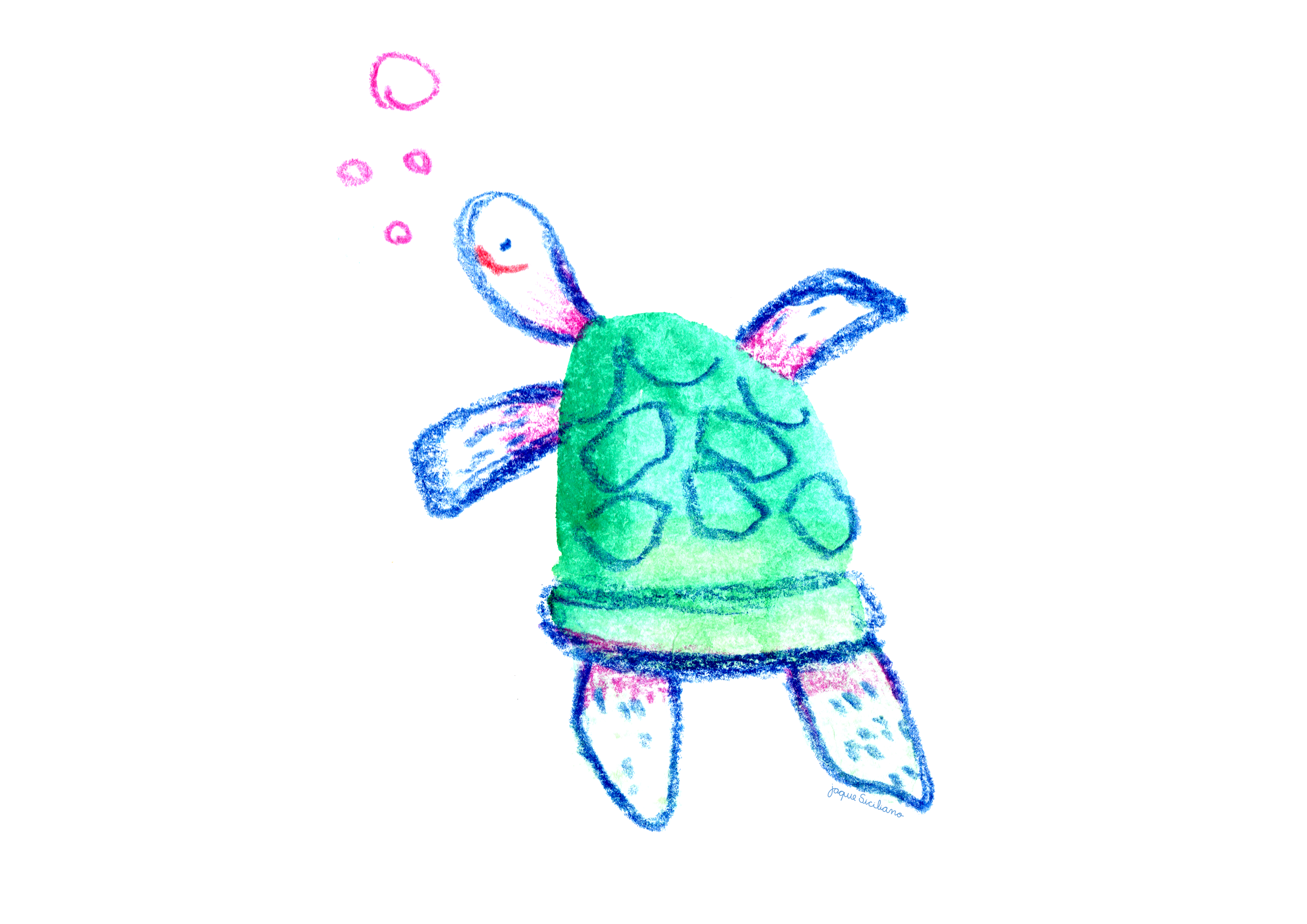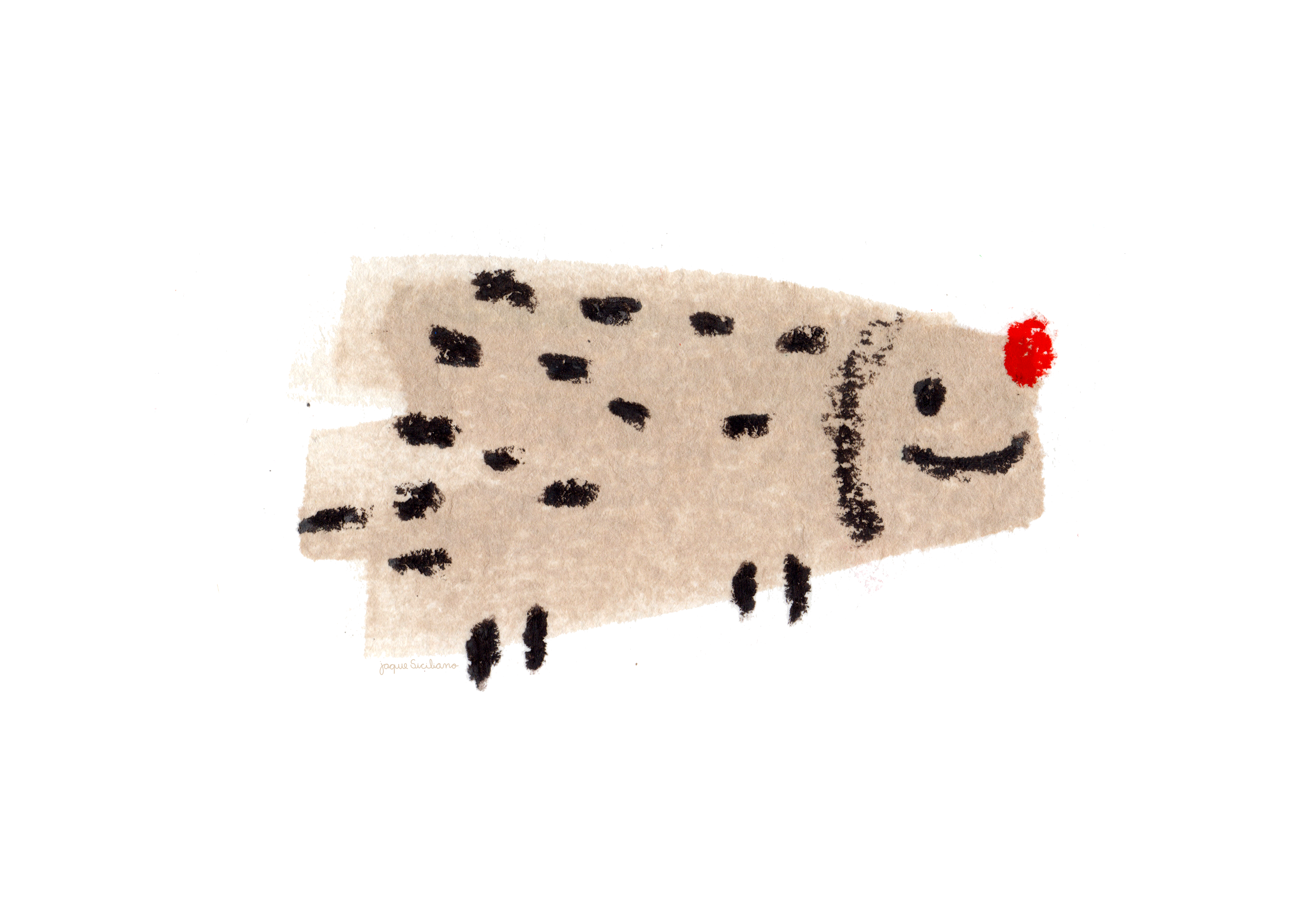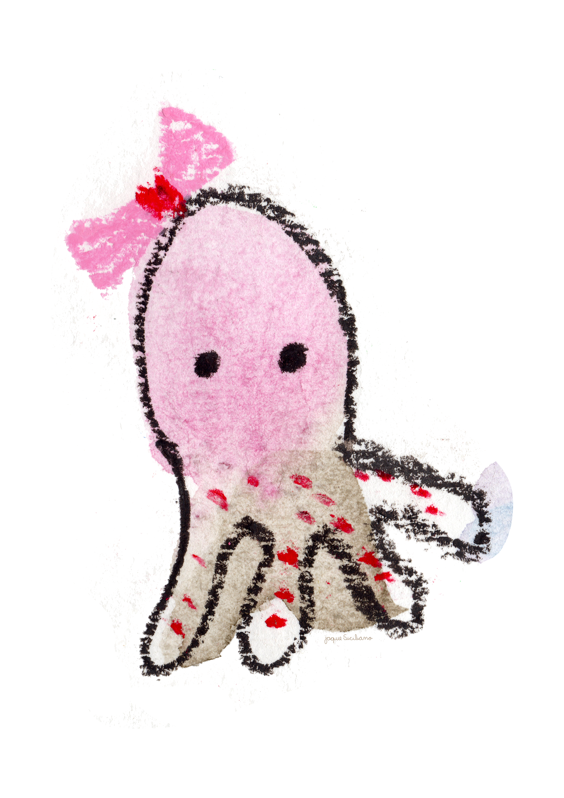 First I create watercolor stains, then I try to see images within those stains. With crayon I make the drawing over the watercolor, scan and finish in Photoshop. I try to mix colors in both watercolor and crayon, it's even more fun and cheerful!